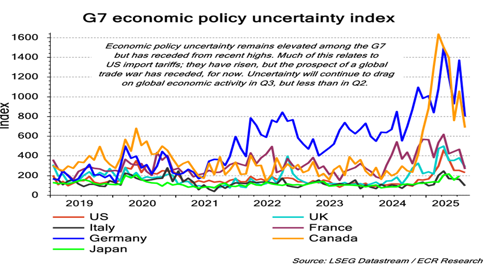 Daarnaast is de angst voor een grote wereldwijde handelsoorlog wat meer naar de achtergrond gekropen, zo blijkt o.a. uit de economische onzekerheidsindex van de G7 (zie onderstaande grafiek). Het vooruitzicht dat landen in de toekomst aanzienlijke productiviteitswinsten kunnen behalen met behulp van kunstmatige intelligentie, speelt hierin zeker een rol. Naast alle uitdagingen zijn er dus volop kansen voor beleggers in de huidige marktomstandigheden. In het algemeen sloten de aandelenbeurzen de maand september positief af.